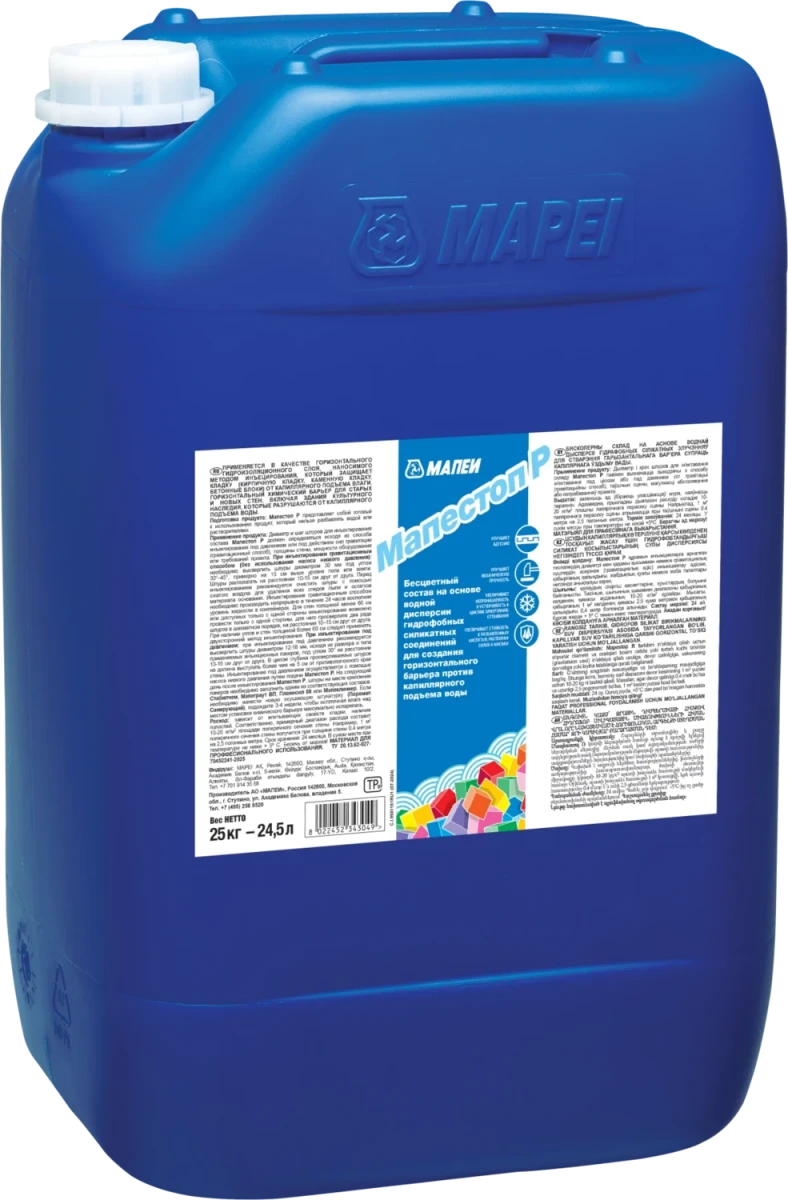 Мапестоп Р – это водный раствор на основе гидрофобизирующих силикатов, действие которого заключается в том, что в результате химической реакции (продукт вступает в реакцию со свободными ионами кальция и углекислым газом) образуются нерастворимые соединения, которые сужают и заполняют капилляры.