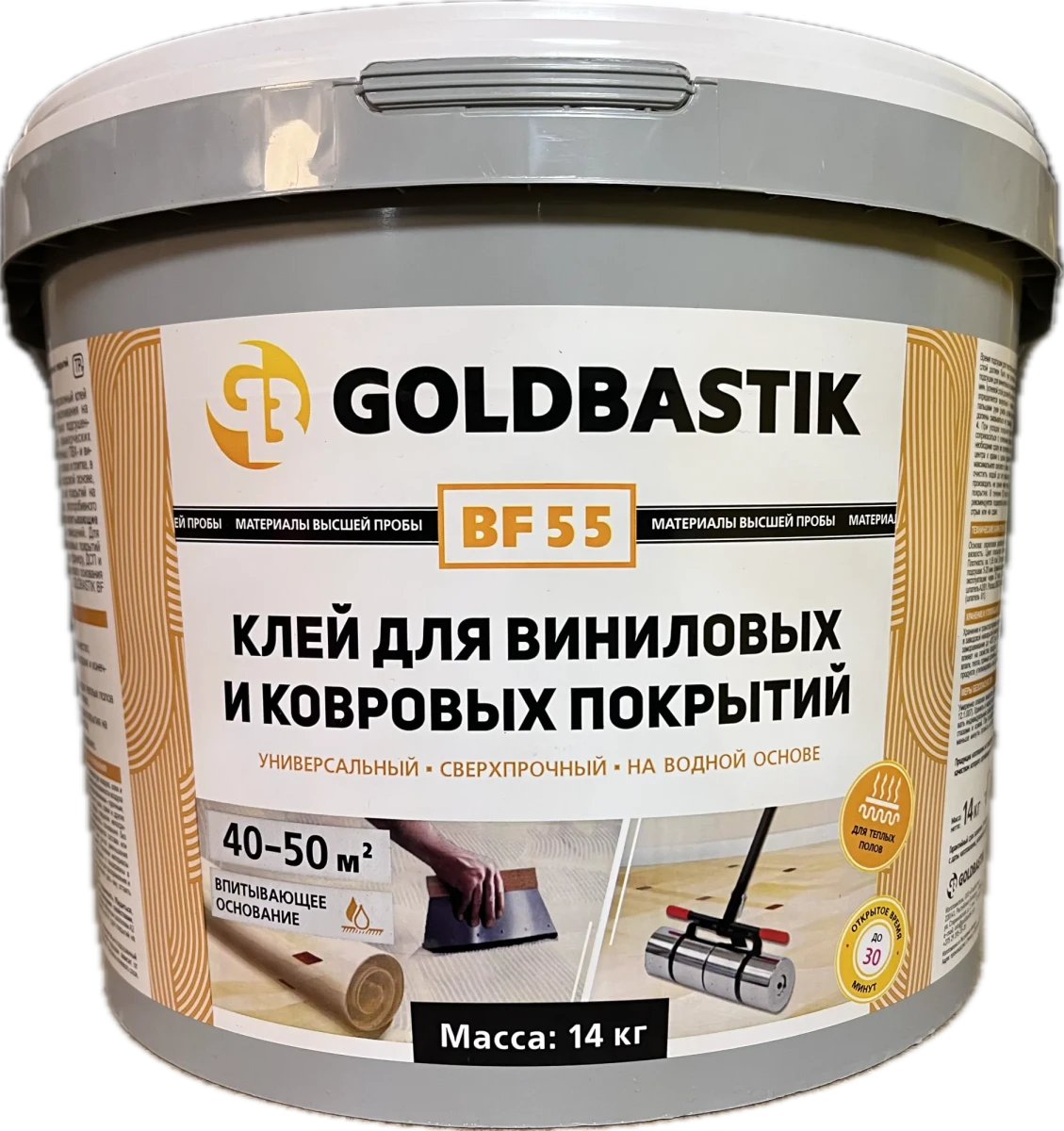 рофессиональный водно-дисперсионный клей Goldbastik BF 55 для гибких напольных покрытий. Подходит для иглопробивного ковролина, текстильных и ковровых покрытий на различных основах, а также для покрытий из поливинилхлорида (ПВХ) и винила в рулонах и плитке. Этот универсальный состав подходит для сверхпрочного приклеивания на впитывающие основания различных покрытий: