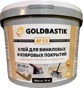 рофессиональный водно-дисперсионный клей Goldbastik BF 55 для гибких напольных покрытий. Подходит для иглопробивного ковролина, текстильных и ковровых покрытий на различных основах, а также для покрытий из поливинилхлорида (ПВХ) и винила в рулонах и плитке. Этот универсальный состав подходит для сверхпрочного приклеивания на впитывающие основания различных покрытий: