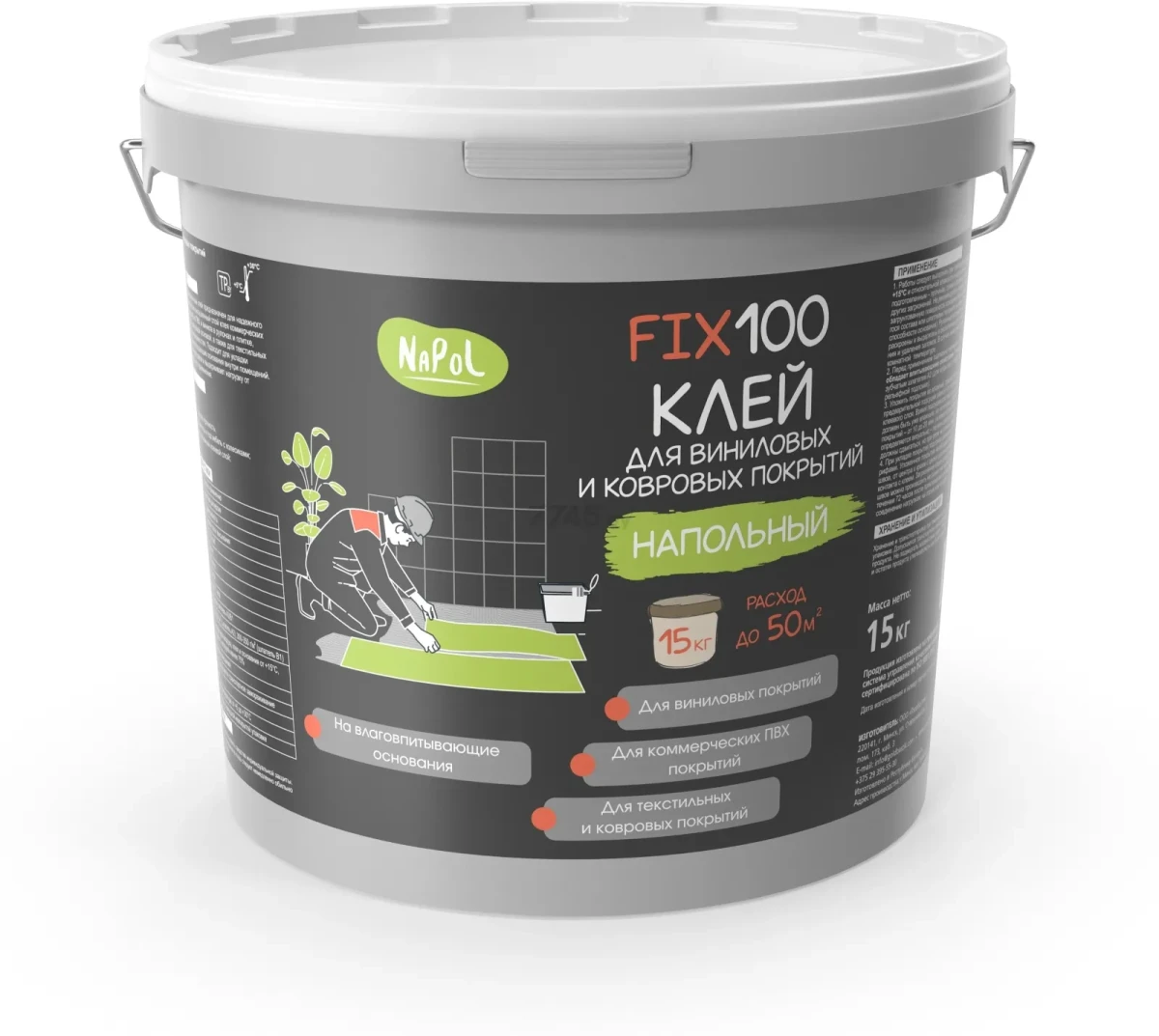 Специализированный водно-дисперсионный клей предназначен для надежного склеивания на влажный, предварительно высушенный слой клея коммерческих (гомогенных и гетерогенных) покрытий из ПВХ и винила в рулонах и плитке, включая материалы с вспененной и ворсовой основой, а также для текстильных и ковровых покрытий на различных поверхностях.